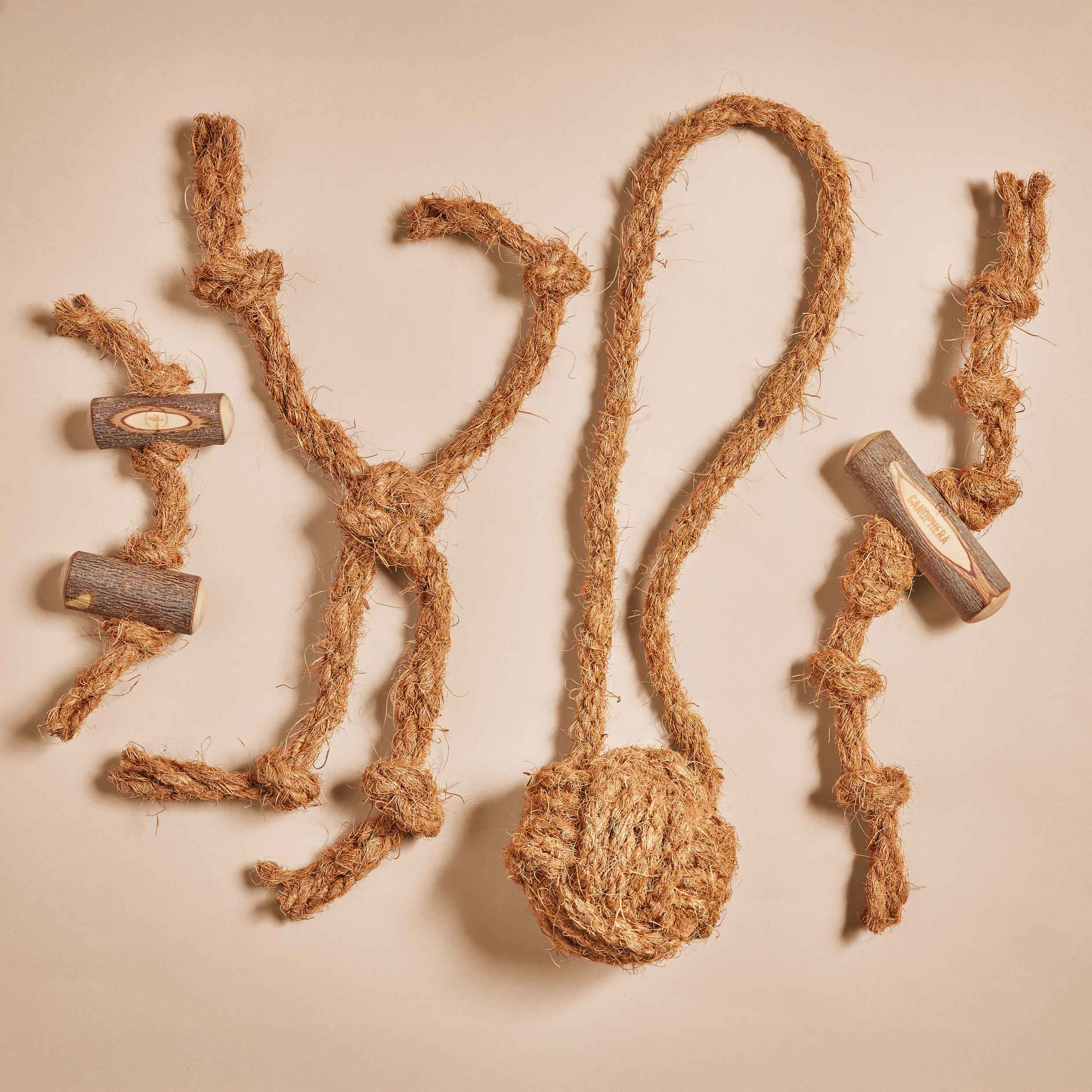 Das Kokosseil wird von einem kleinen, lokalen Familienunternehmen in Handarbeit hergestellt, in dem diese Art von Seil aus der Schale der Kokosnuss seit Generationen hergestellt wird. In Zusammenarbeit mit dieser Familie haben wir eine Seilalternative entwickelt, die sich perfekt als Hundespielzeug eignet. Sie enthält mehr Fäden als üblich, um die Zahnhygiene besser zu unterstützen.
