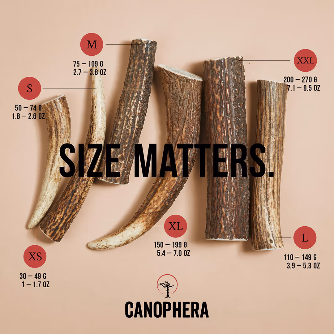 To ensure there is a chew for all dogs, our Red Deer Antlers come in several sizes. CANOPHERA antlers come in Extra Small through Extra Extra Large and are suitable for adult dogs and puppies 6 months and up.